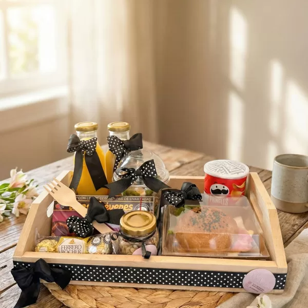 - Desayuno sorpresa Bogotá - Bandeja para caballero Incluye Bandeja de madera Mantel tipo picnic Lazo decorativo Croissant relleno de jamón. queso. lechuga y tomate Jugo de naranja Cafe con leche ó tinto Papitas pringles pequeñas Ferreros rocher x 3 unidades Maní en envase de cristal Uvas cheveres Cubiertos de madera biodegradable Tarjeta personalizada Domicilio en Bogotá (NO INCLUIDO) NOTA: Debido…