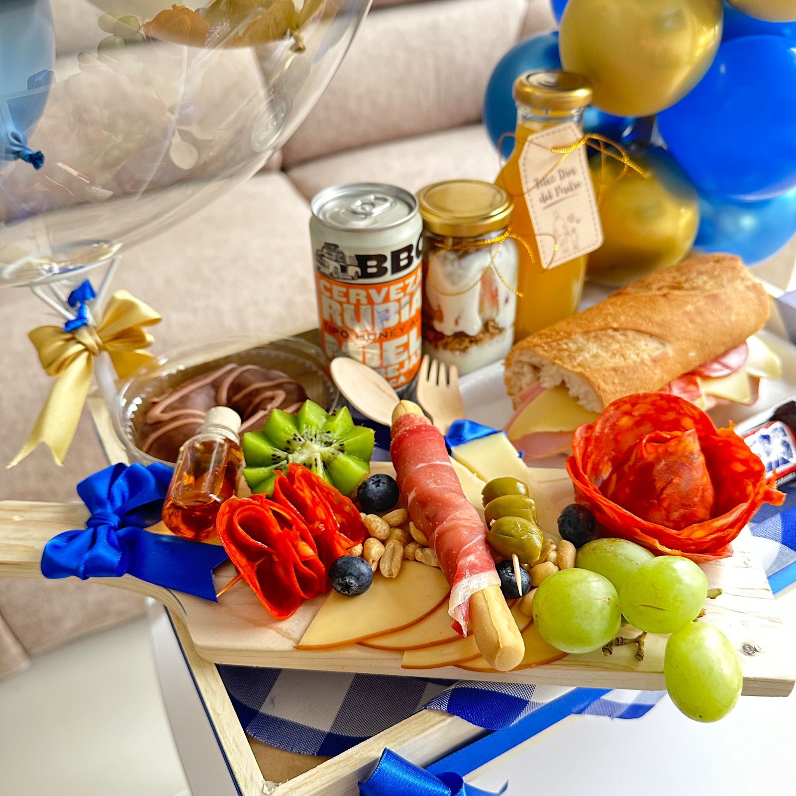 • Tabla de madera con chorizo vela, queso suizo, queso manchego, jamón cerrano, uvas verdes y arandanos