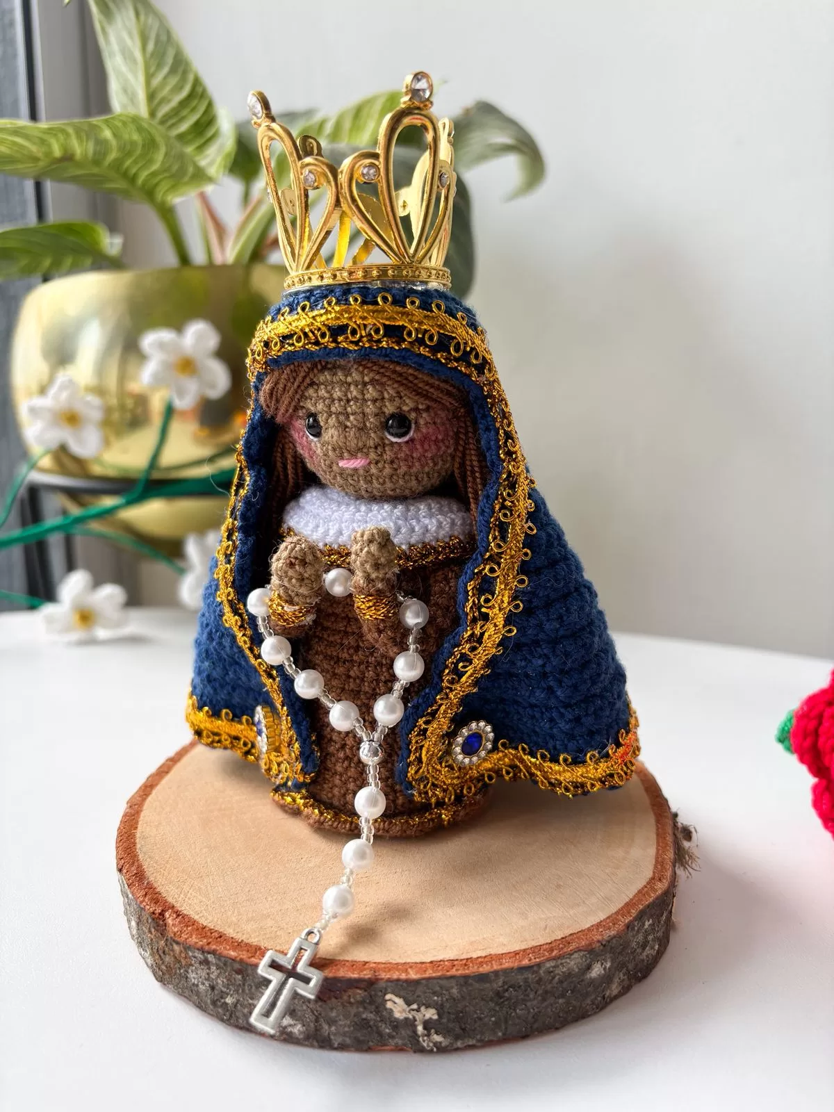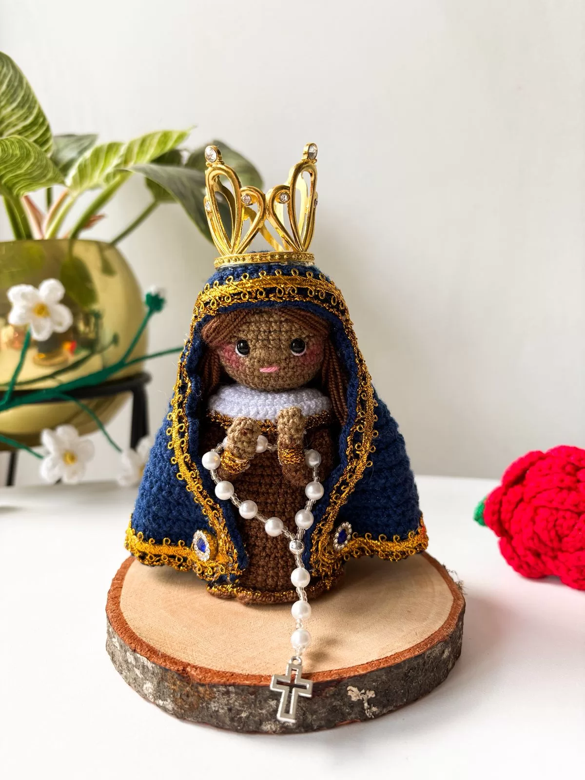 Lleva a tu hogar la paz infinita de la Virgen Morenita. Esta hermosa pieza tejida 100% a mano resalta por su preciosa tez, la delicadeza de su rostro y su hermoso cabello finamente elaborado, cuidando cada detalle para transmitir amor y devoción. Es una compañía sagrada y cercana, perfecta para bendecir tu espacio o para dar un regalo que abrace el alma.